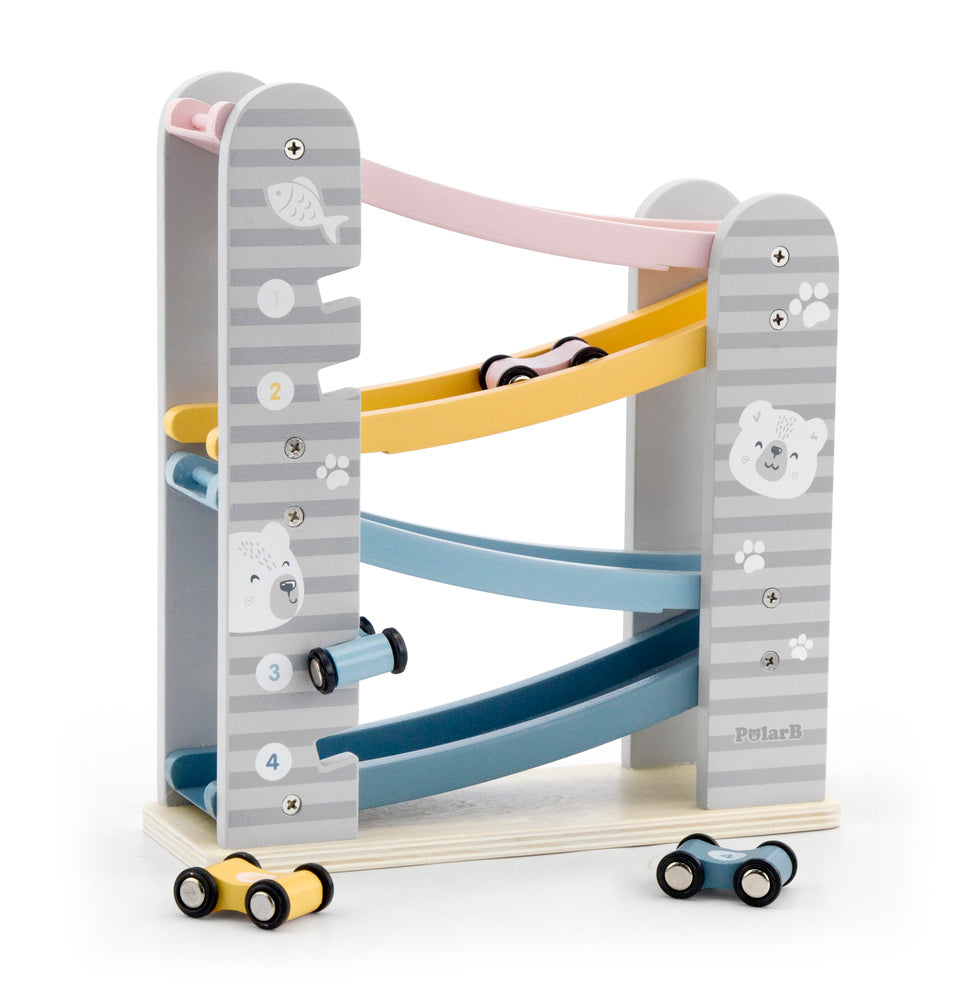 A car slider & 4 mini cars with numbers in different colors. Race the cars down the track learning numbers and matching colors.